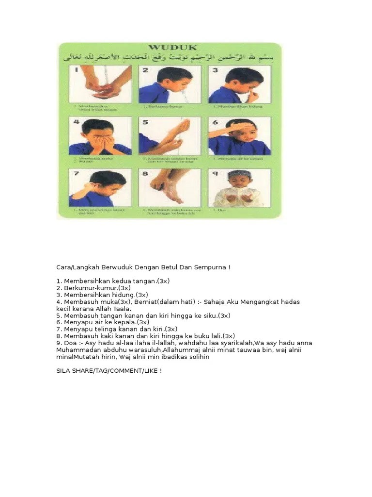 Aku naik saksi tiada tuhan yang disembah melainkan allah, tuhan yang esa tiada sekutu baginya, dan aku naik saksi . Tujuannya untuk membersihkan diri sebelum kita menunaikan solat. Cara berwuduk dengan betul dan sempurna.